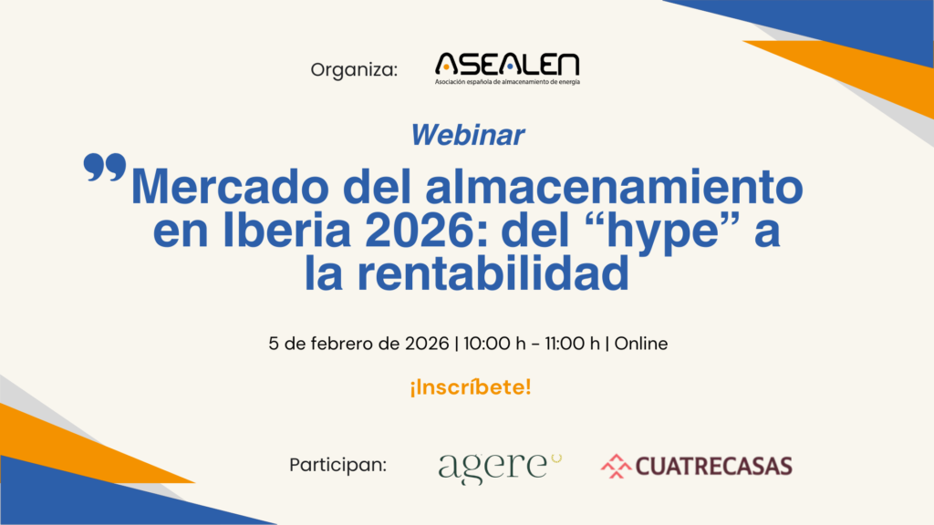 El próximo jueves 5 de febrero, de 10:00 a 11:00, ASEALEN organiza el webinar “Mercado del almacenamiento en Iberia 2026: del ‘hype’ a la rentabilidad”, una sesión en la que analizaremos la evolución real del mercado del almacenamiento energético y las claves que marcarán su viabilidad económica en el corto y medio plazo.